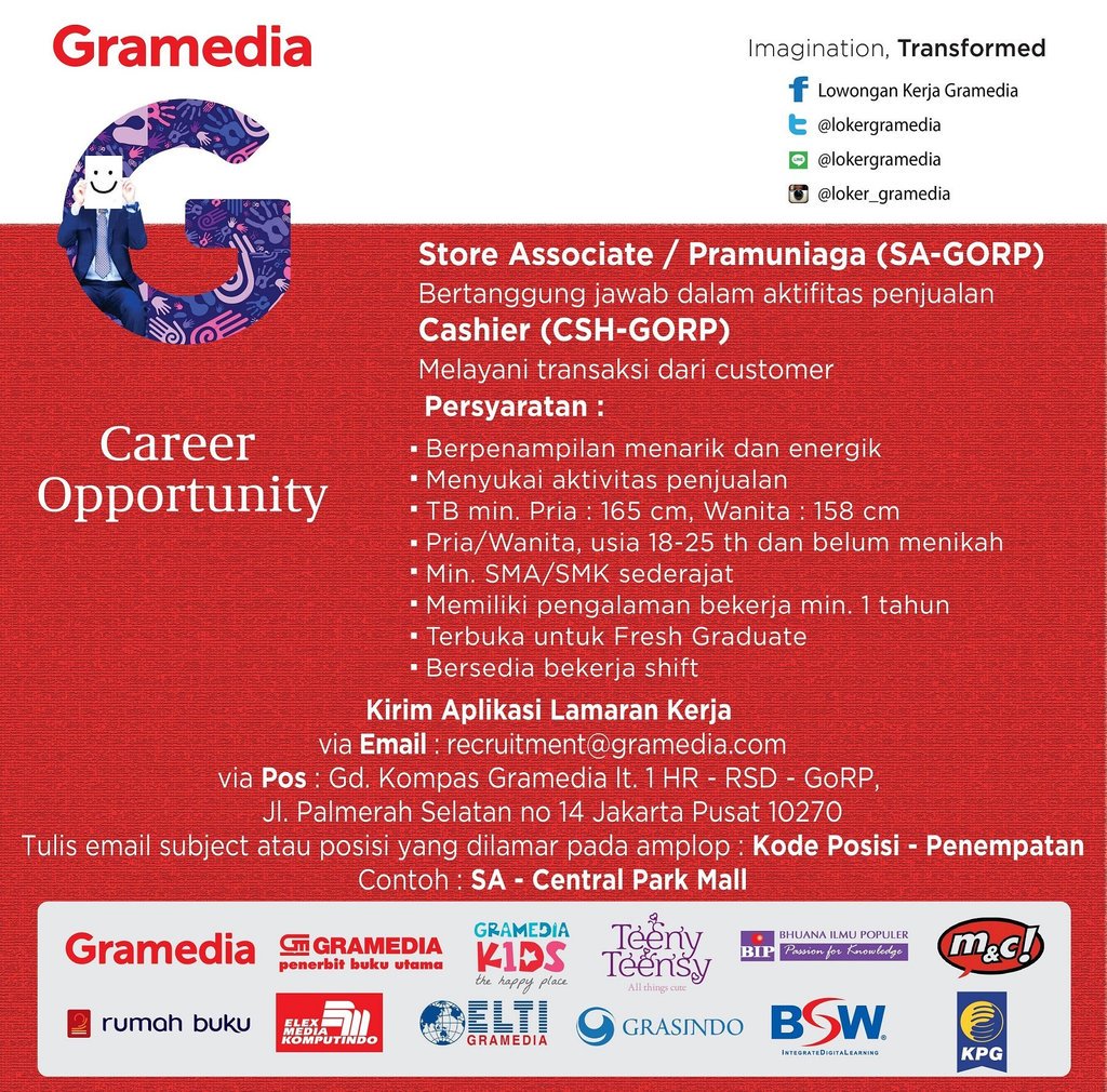 Jika Loker di Jakarta ini sesuai dengan kualifikasi kamu silahkan langsung mengirimkan lamaran melalui situs loker terbaru kami. 134k Followers 73 Following 570 Posts - See Instagram photos and videos from LOKER GRAMEDIA loker_gramedia. Untuk saat ini belum ada lowongan tersedia untuk perusahaan tersebut.