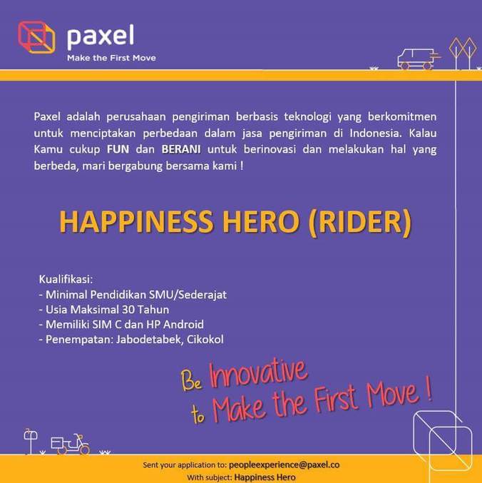 Namanya adalah Happiness Hero. Advertisements Arti Status Pengiriman Paxel Di Indonesia ada banyak jasa pengiriman yang menawarkan kemudahan dan berbagai jenis layanan. Loker Happines Hero Kurir di Paxel Home Yogyakarta - Paxel Home Yogyakarta.